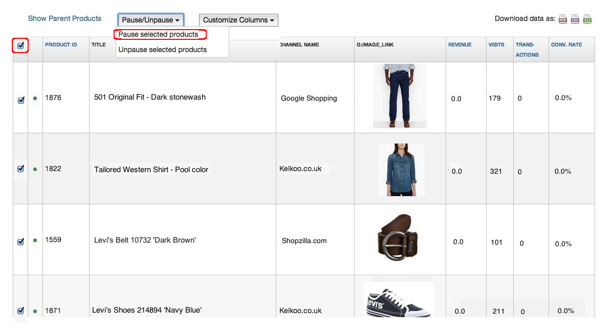 DataFeedWatch-Analytics vous indique les clics, les conversions et les revenus pour chaque produit. Ainsi, vous pouvez identifier les produits non rentables et les supprimer d’un simple clic. Cela vous permet d’améliorer les résultats de vos campagnes.