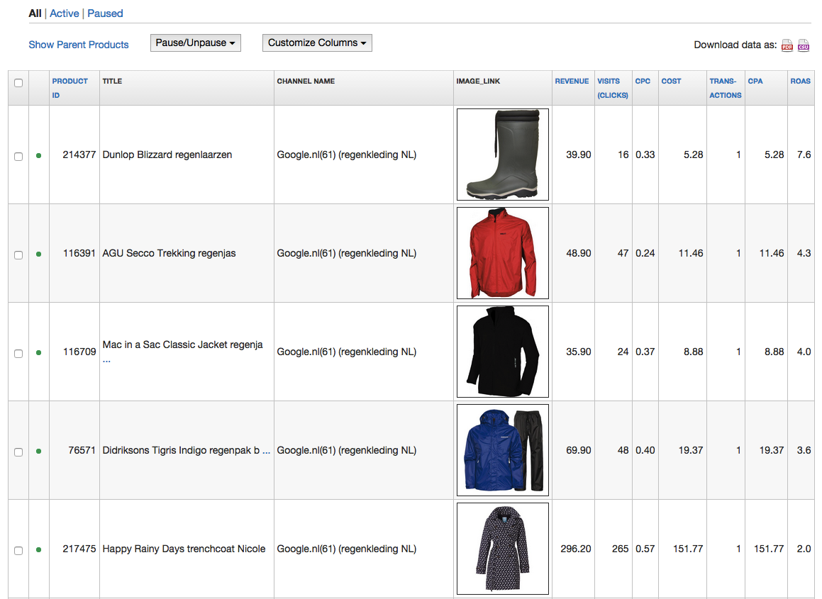 C’est simple : nous ajoutons un code de suivi aux URL de vos produits. Cela nous permet de suivre les données par produit et par canal. Nous téléchargeons ensuite vos statistiques Google Analytics et présentons toutes les données de performance par produit dans un récapitulatif simple :
