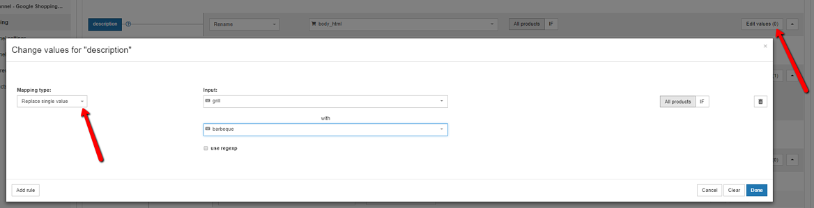 Dans DataFeedWatch, vous pouvez facilement créer une règle qui remplace le gril par un barbecue, comme celle ci-dessous. Cela mettra automatiquement à jour tous vos titres et utilisera le nouveau mot-clé.