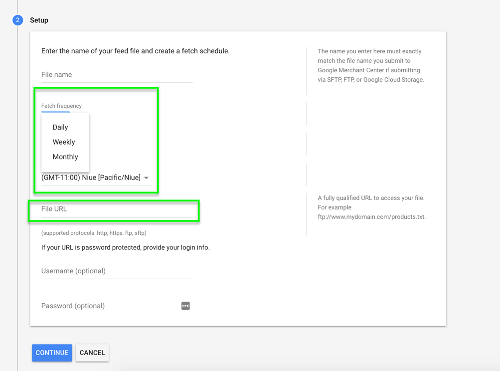 - À quelle fréquence souhaitez-vous que Merchant Center récupère vos données? (Cela doit être au moins une fois par mois, mais il peut être quotidien.)