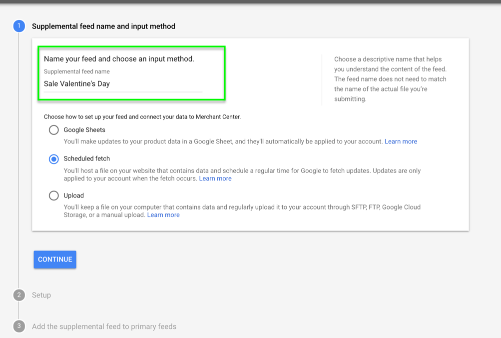 - Sachez comment vous allez importer votre flux (feuilles Google, récupération planifiée, importation directe) Pour certains types de téléversement, vous devrez peut-être fournir le nom exact du fichier que vous avez utilisé.