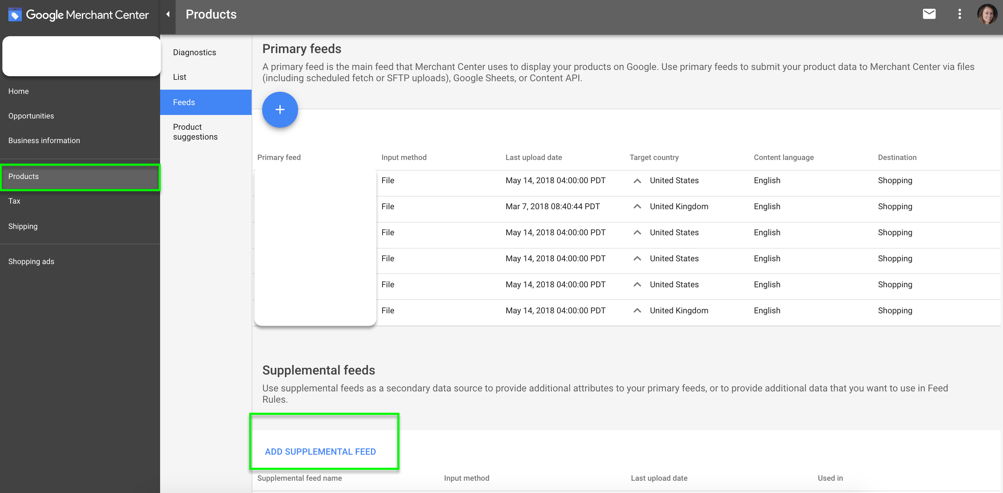 Maintenant, si vous n'utilisez pas un outil tiers pour l'optimisation des flux et que vous devez vous fier aux flux supplémentaires pour créer certains types d'optimisations, voyez comment vous pouvez les ajouter dans votre compte Google Merchant.