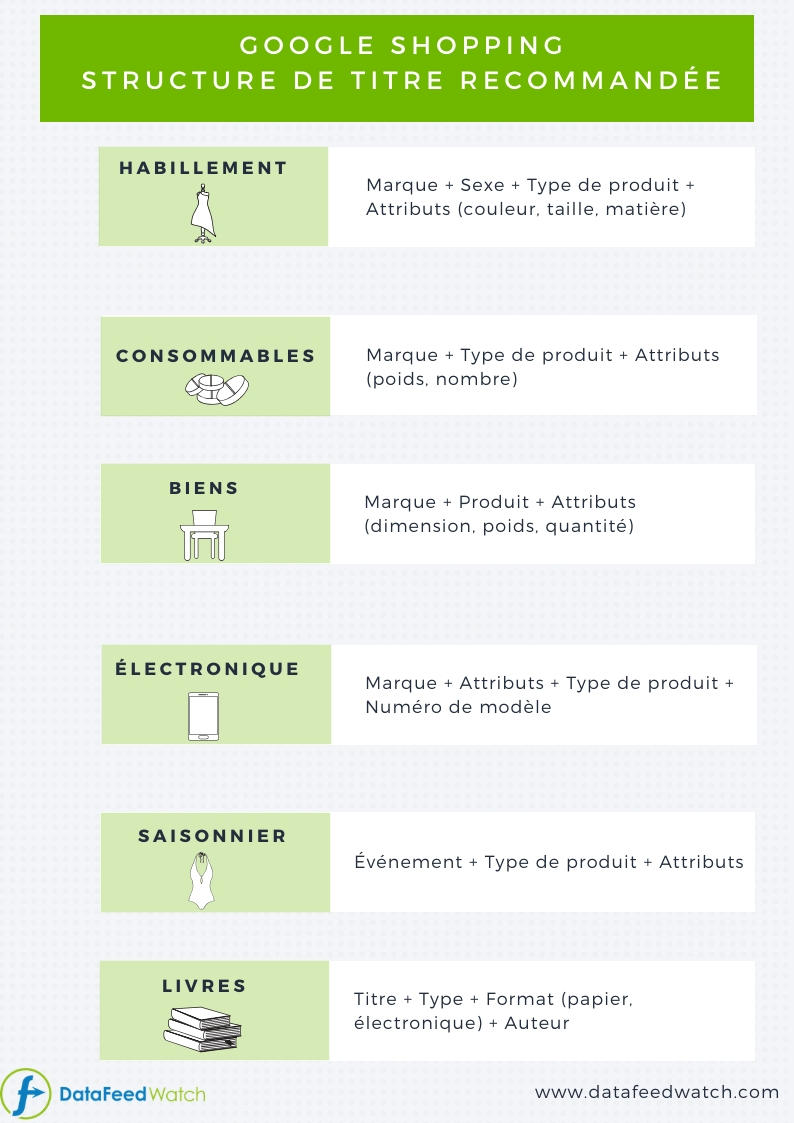 Suivez exactement les instructions de Google Shopping pour augmenter vos chances de vente. Consultez ici les principales exigences relatives aux titres.