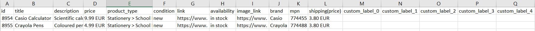 Vous devez aussi leur demander d'ajouter 5 colonnes vides supplémentaires, les fameux libellés personnalisés. Grâce à ces colonnes vides et magiques, vous pourrez insérer des champs supplémentaires par vous-même, sans avoir besoin de demander aux développeurs de modifier le flux de leur côté, ce qui prendrait un temps fou et de nombreux allers-retours par e-mail. Vous pouvez ajouter un prix de vente promotionnel, une date de début et de fin de promotion, la catégorie du produit, une description supplémentaire, les frais de port et bien plus encore.