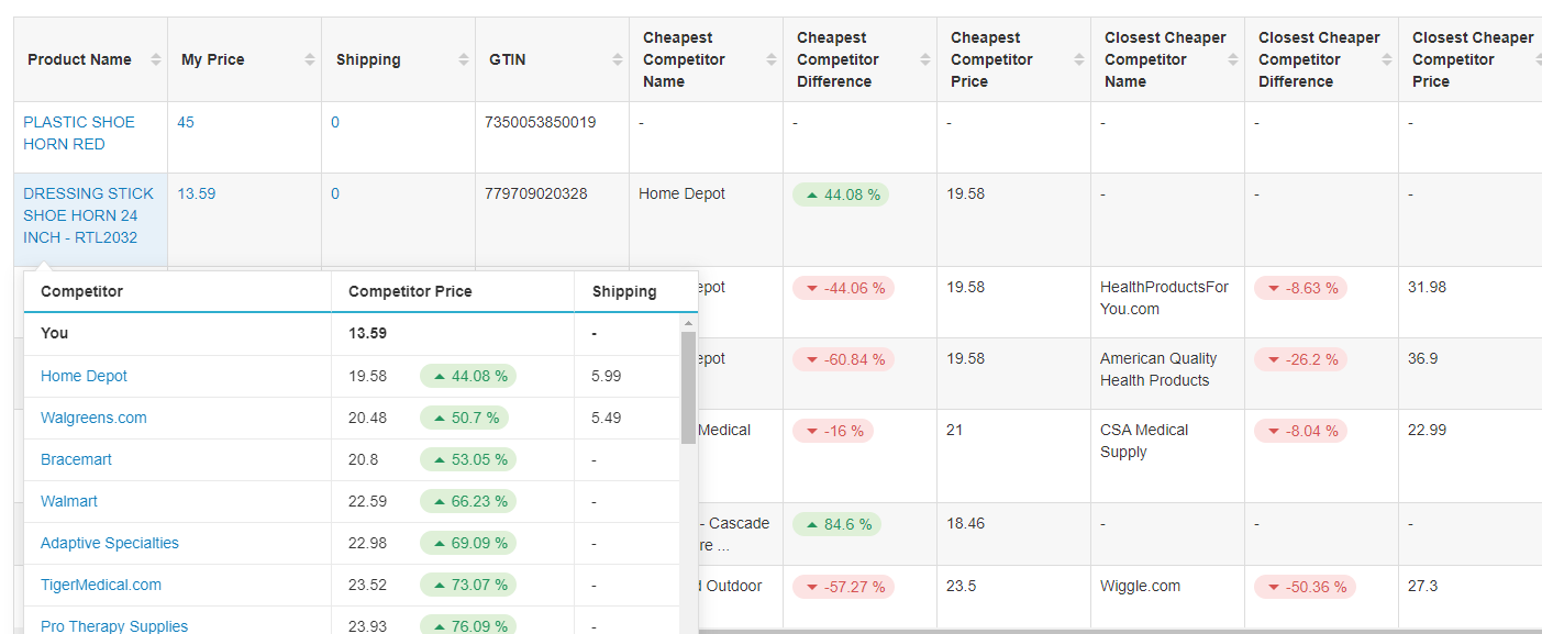Dans Price Watch Alpha, nous fournissions un résumé sur des concurrents spécifiques en un coup d'œil. Cette option était disponible lorsque vous survoliez la catégorie Nom du produit, comme ci-dessous: